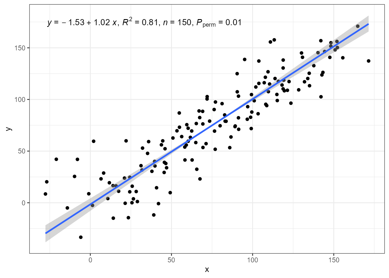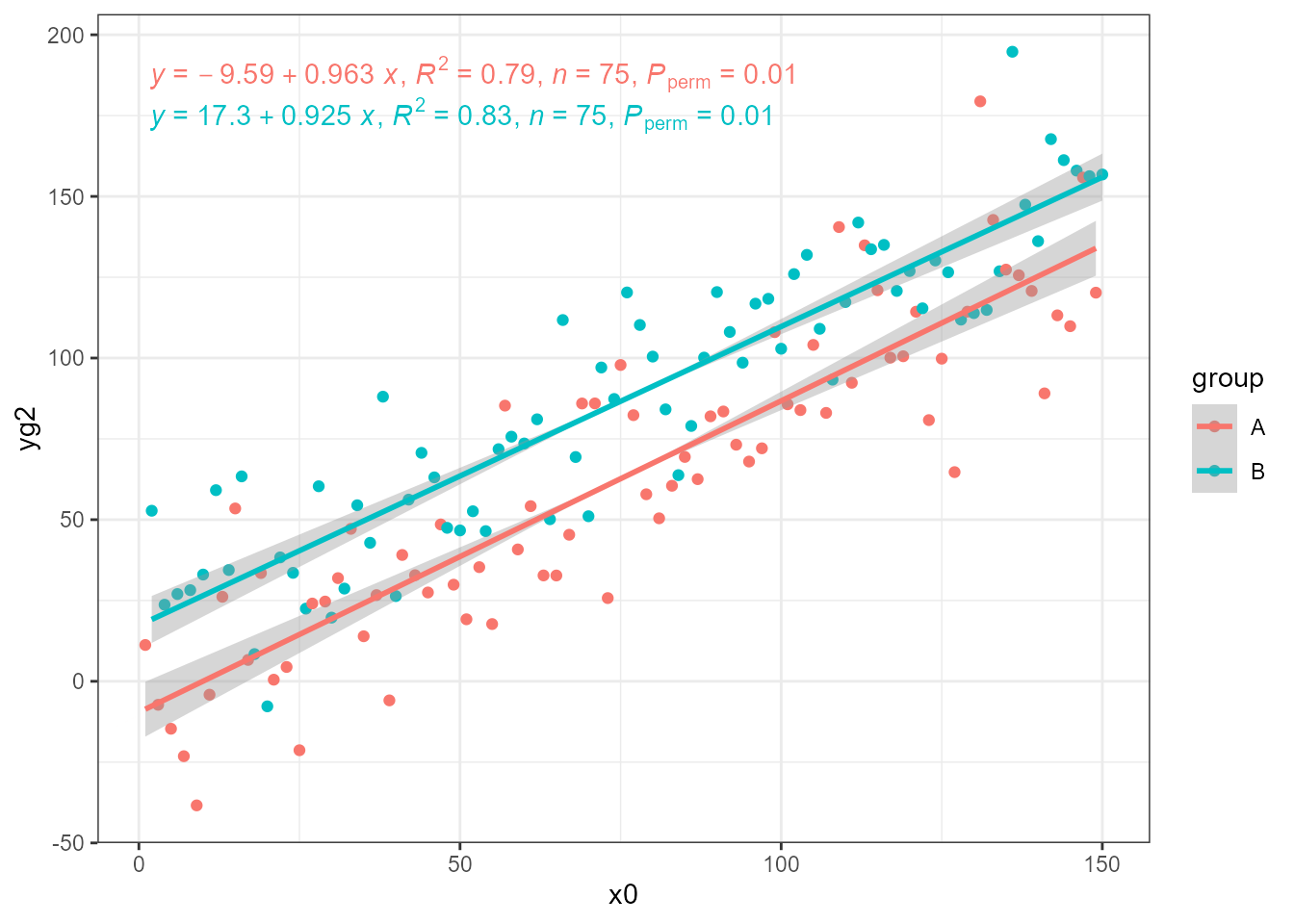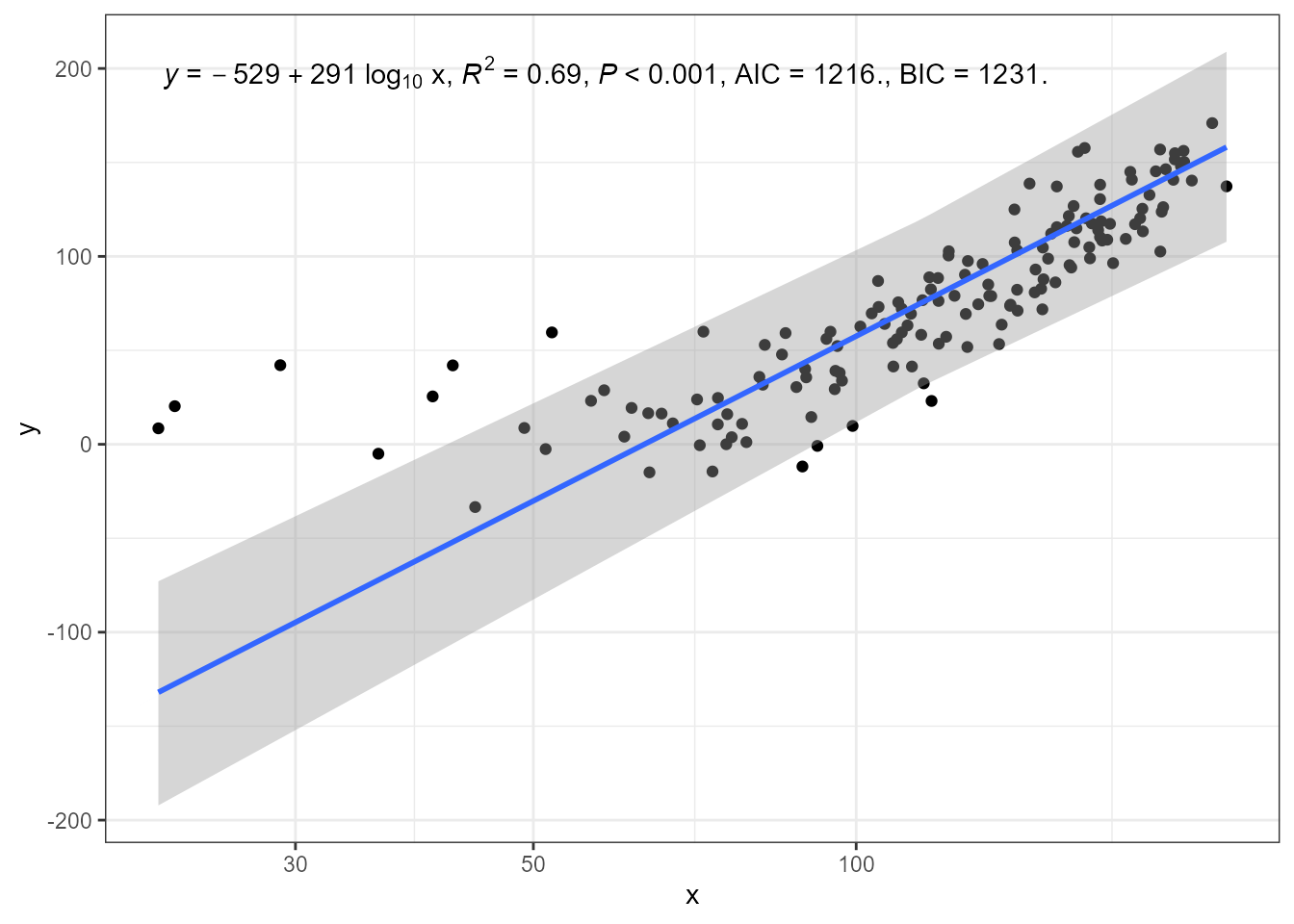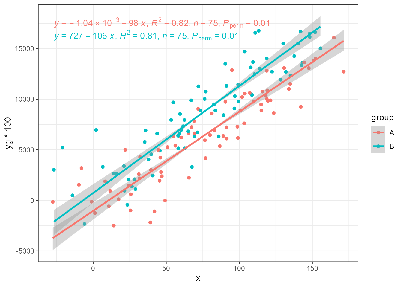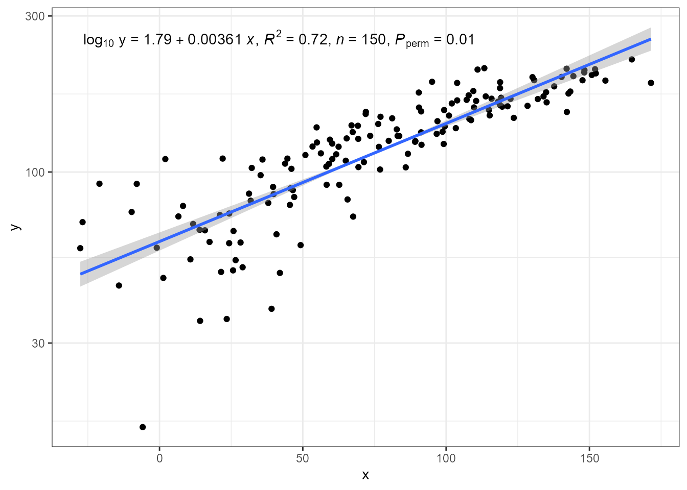 It is also important to remember that in most cases data analysis including exploratory and other stages should take place before annotated plots for publication are produced. Even though data analysis can benefit from combined numerical and graphical representation of the results, the use I envision for ‘ggpmisc’ is mainly for the production of plots for publication or communication. In case case, whether used for analysis or communication, it is crucial that users cite and refer both to ‘ggpmisc’ and to the underlying R and R packages when publishing plots created with functions and methods from ‘ggpmisc’.