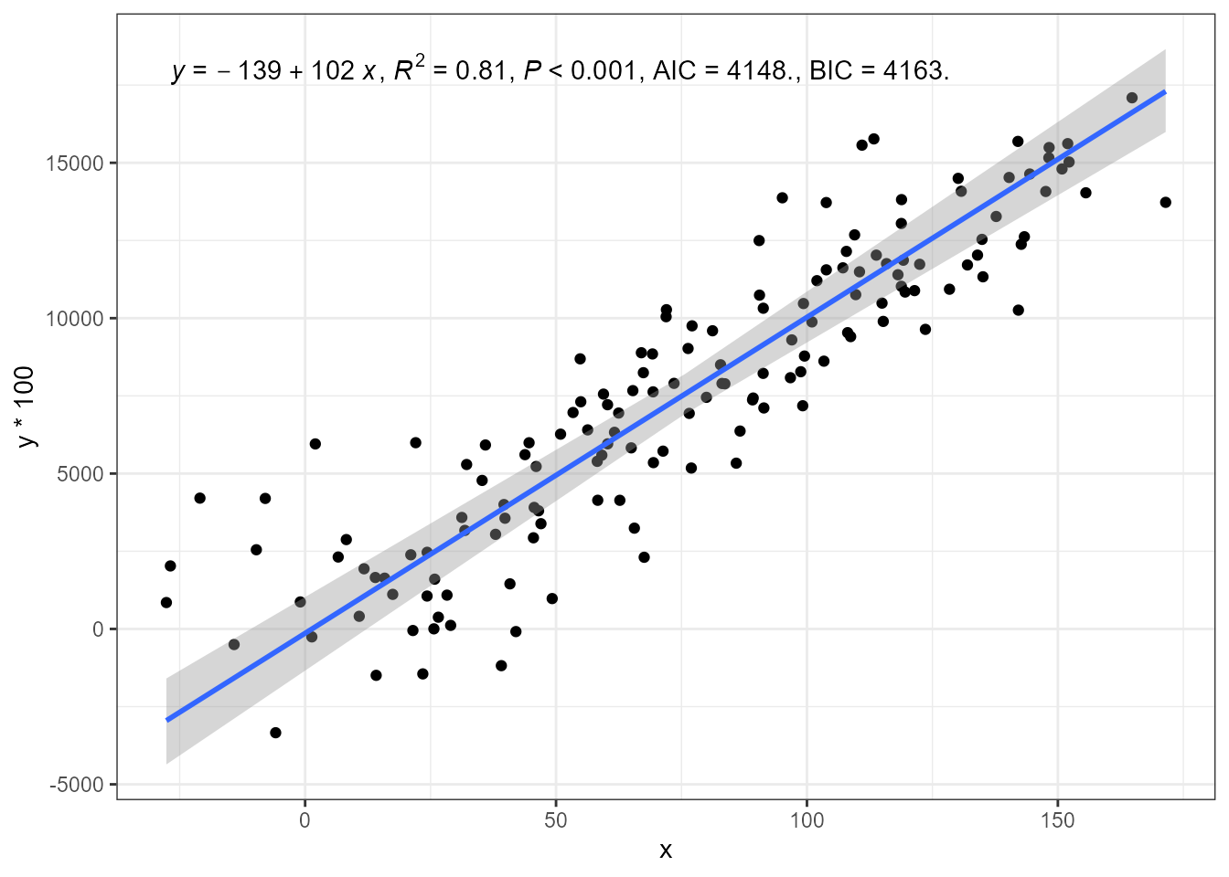 To avoid confusion it is good to make clear what may seem obvious to some: if no plot is needed, then there is no reason to use this package. The values shown as annotations are not computed by ‘ggpmisc’ but instead by the usual model-fit and statistical functions from R and other packages. The same is true for model predictions, residuals, etc. that some of the functions in ‘ggpmisc’ display as lines, segments, or other graphical elements.