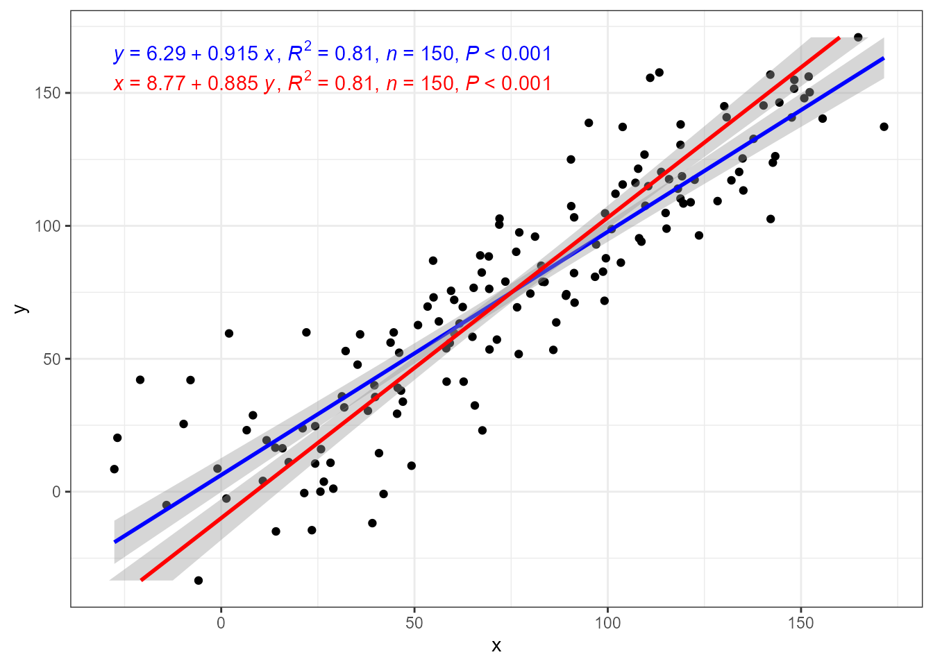 In the figure above we saw that the ordinary least squares (OLS) linear regression of y on x and x on y differ. Major axis regression provides an estimate of the slope that is independent of the direction of prediction, x \to y or y \to x, while the estimate of R^2 remains the same in all three model fits.