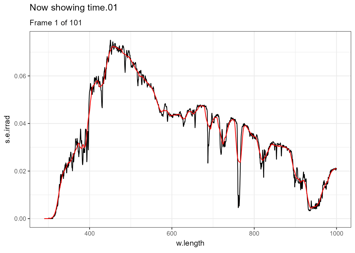 There are few situations where applying transformations to multiple spectra does not result in overcrowded plots, one example being animated plots where different layers are displayed sequentially. Further examples of animations are available in the separate on-line only package article Animated plots of spectral data. In this case a smoothed version of each spectrum is displayed in red and the measured spectrum in black.