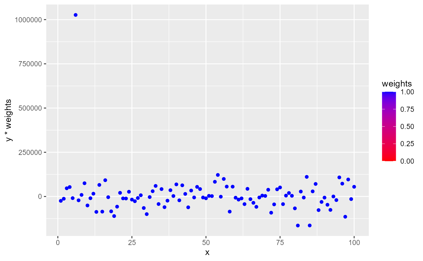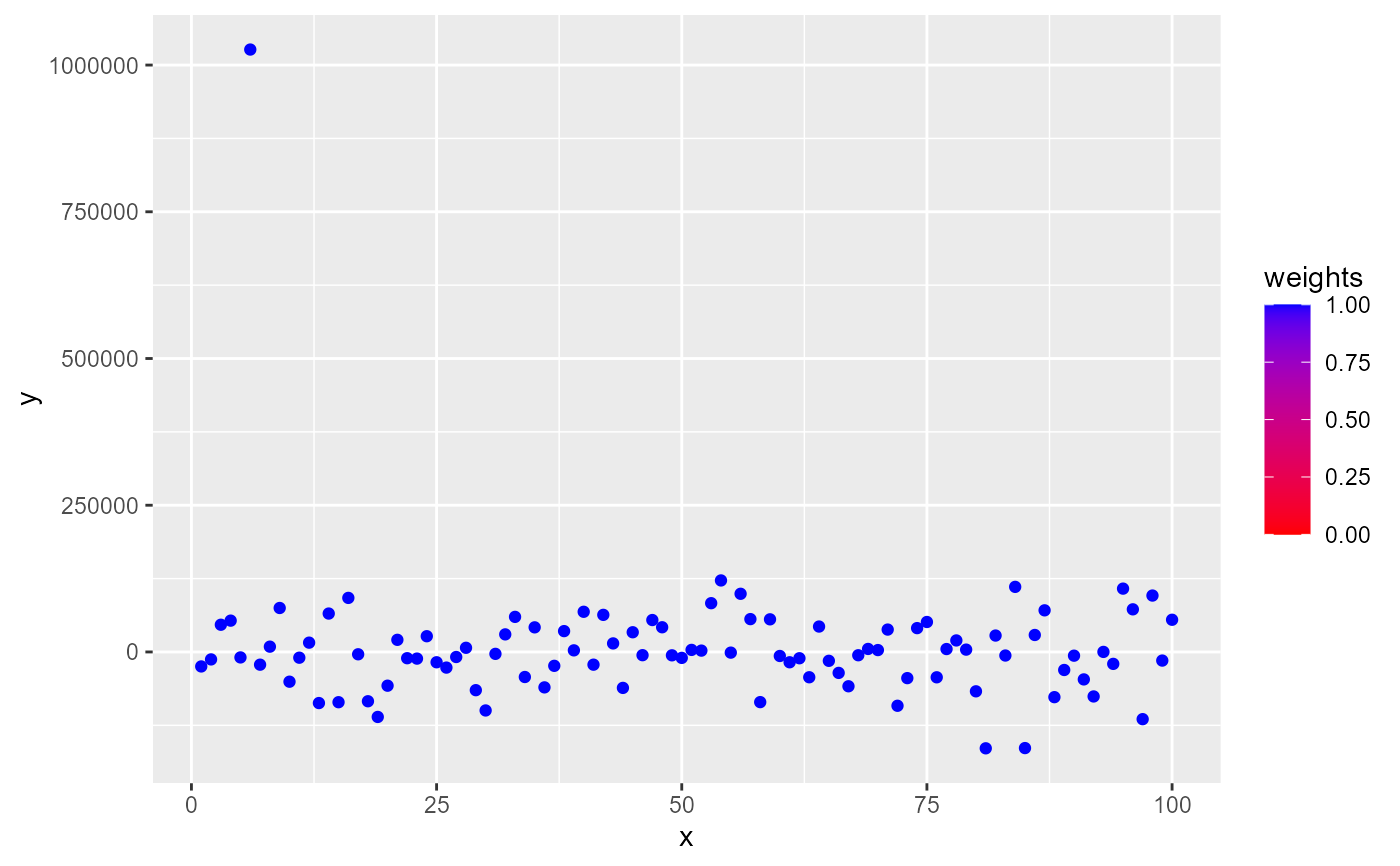 my.data.outlier[6, "y"] <- my.data.outlier[6, "y"] * 10