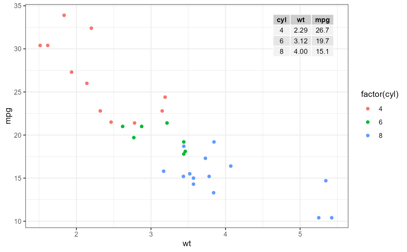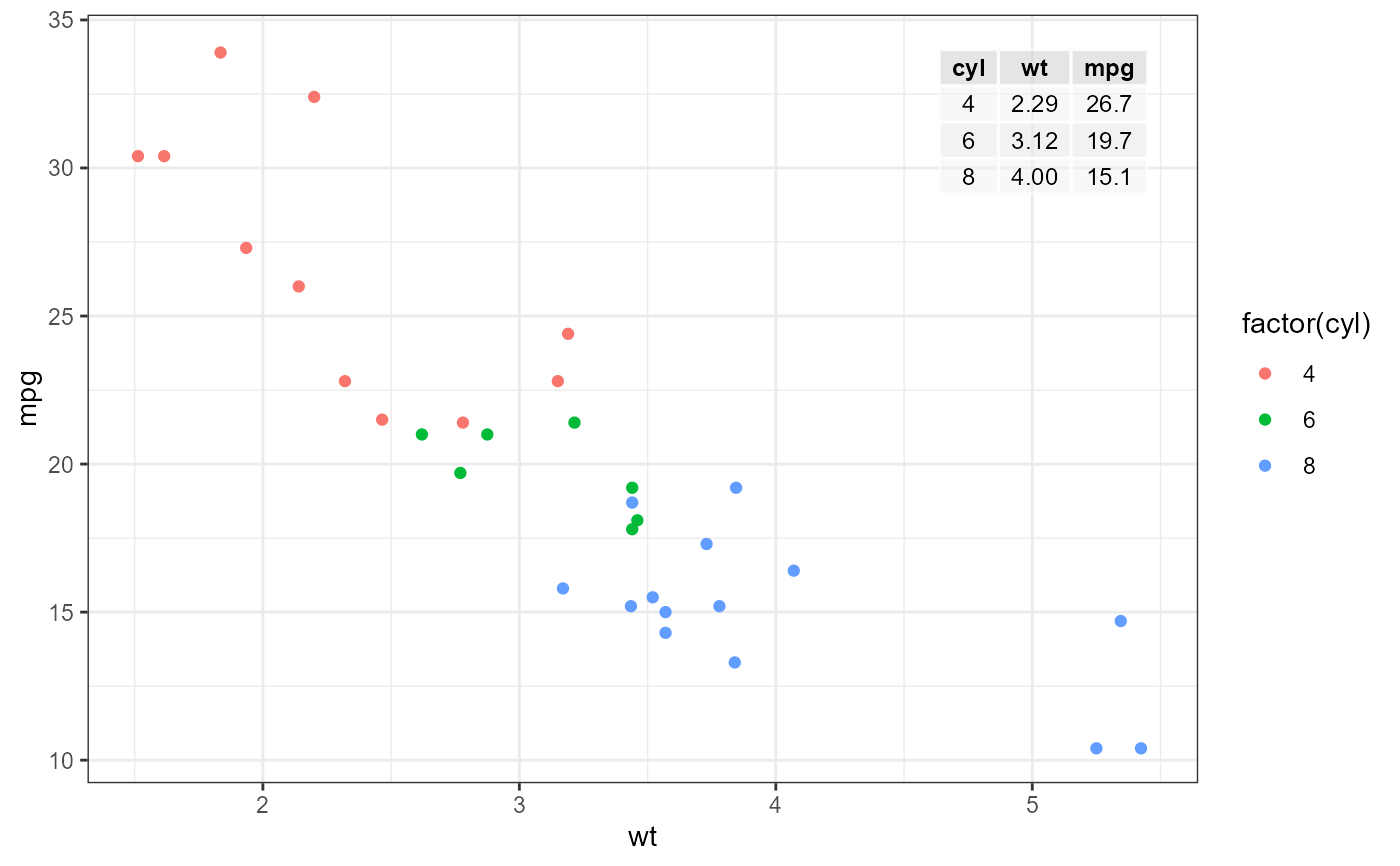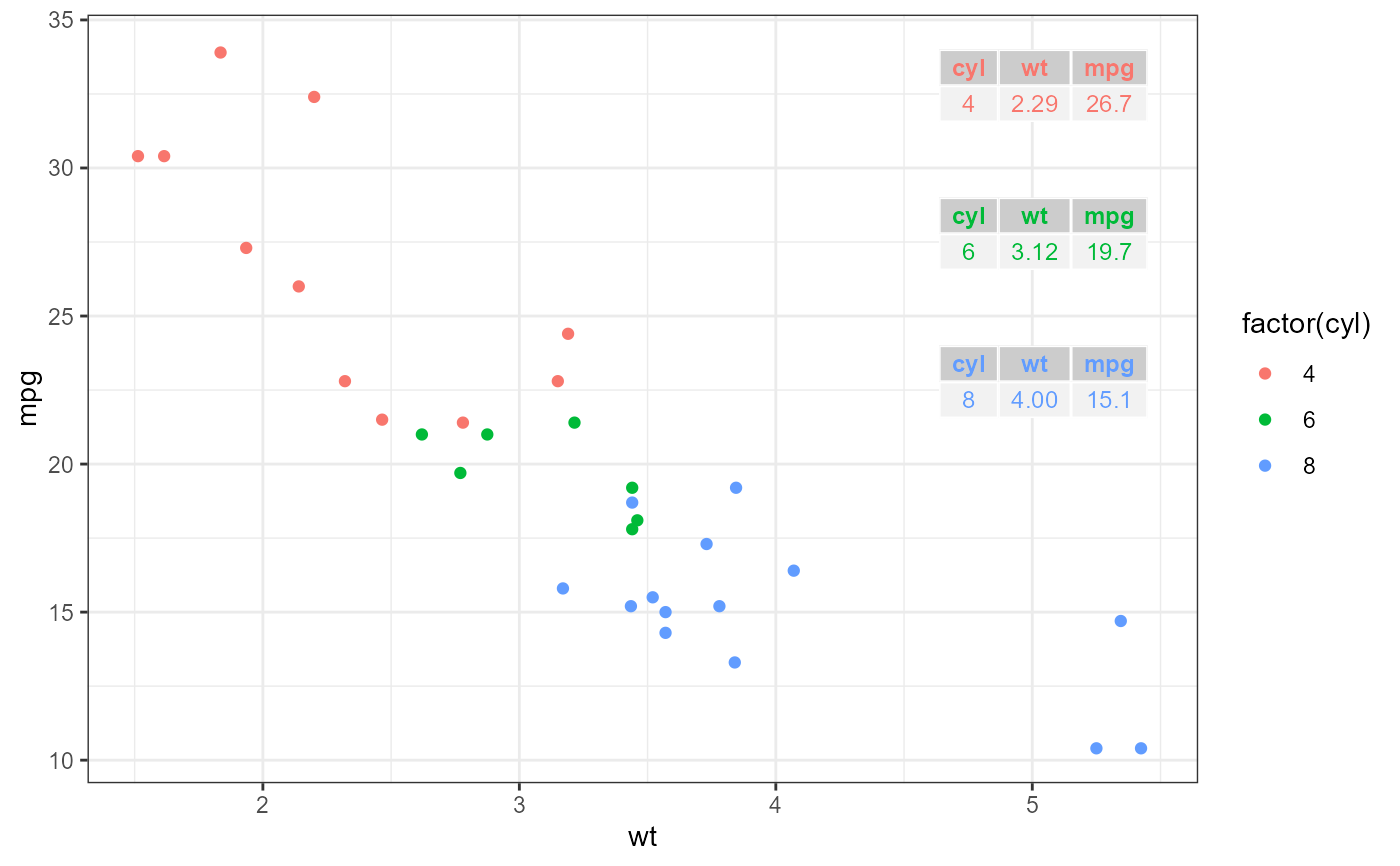 ggplot(mtcars, aes(wt, mpg, colour = factor(cyl))) +