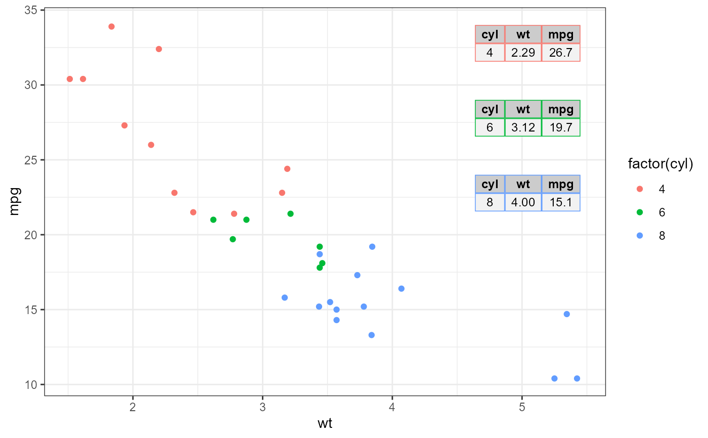 This geometry is inspired on answers to two questions in Stackoverflow. In contrast to these earlier examples, the current geom obeys the grammar of graphics, and attempts to be consistent with the behaviour of 'ggplot2' geometries. https://stackoverflow.com/questions/12318120/adding-table-within-the-plotting-region-of-a-ggplot-in-r https://stackoverflow.com/questions/25554548/adding-sub-tables-on-each-panel-of-a-facet-ggplot-in-r?