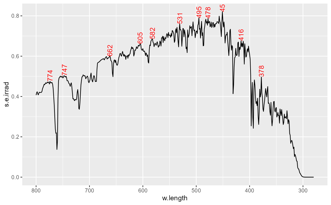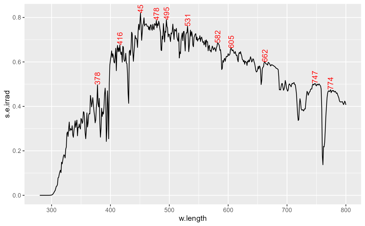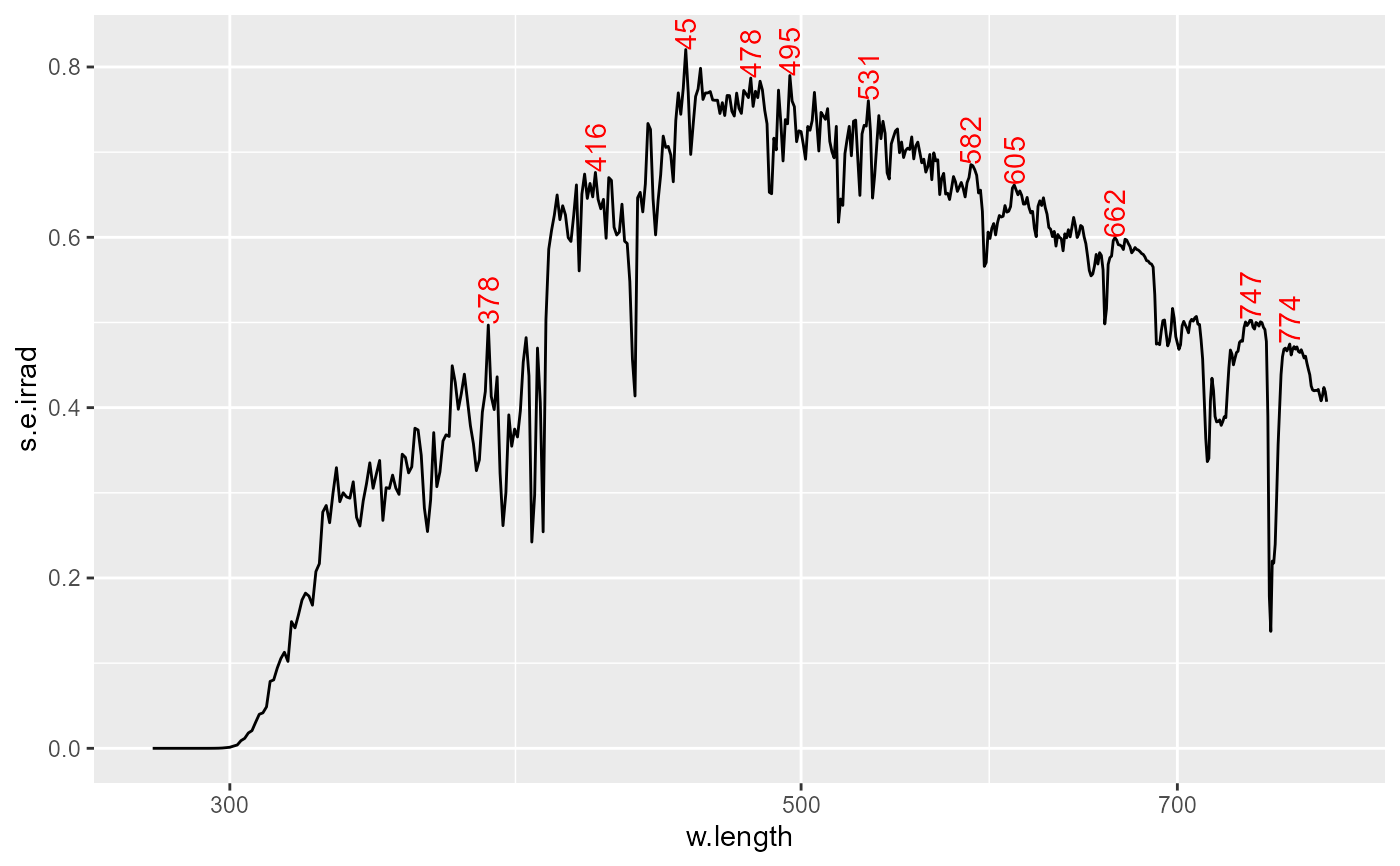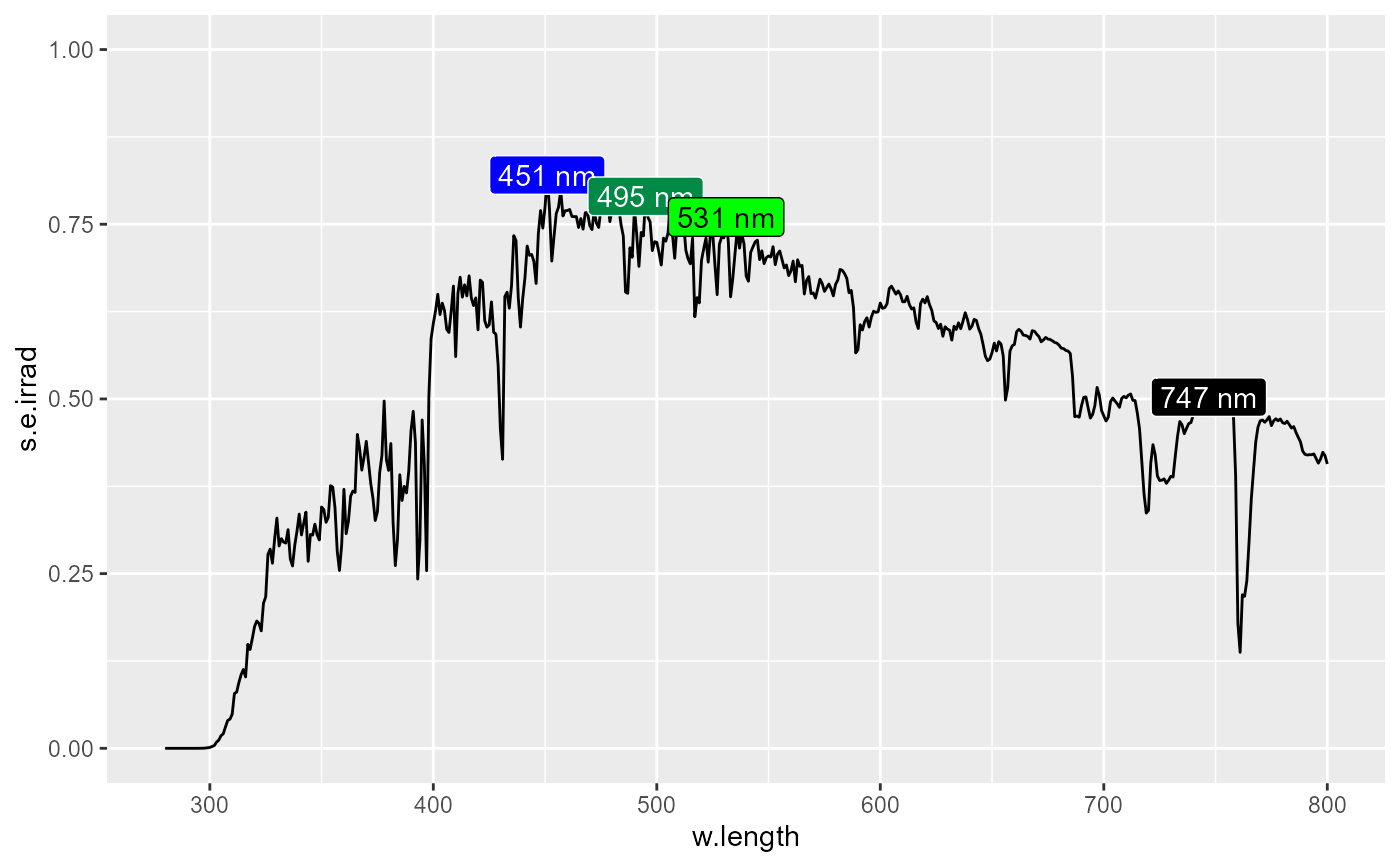 stat_label_peaks(span = 41, geom = "label", label.fmt = "%3.0f nm") +